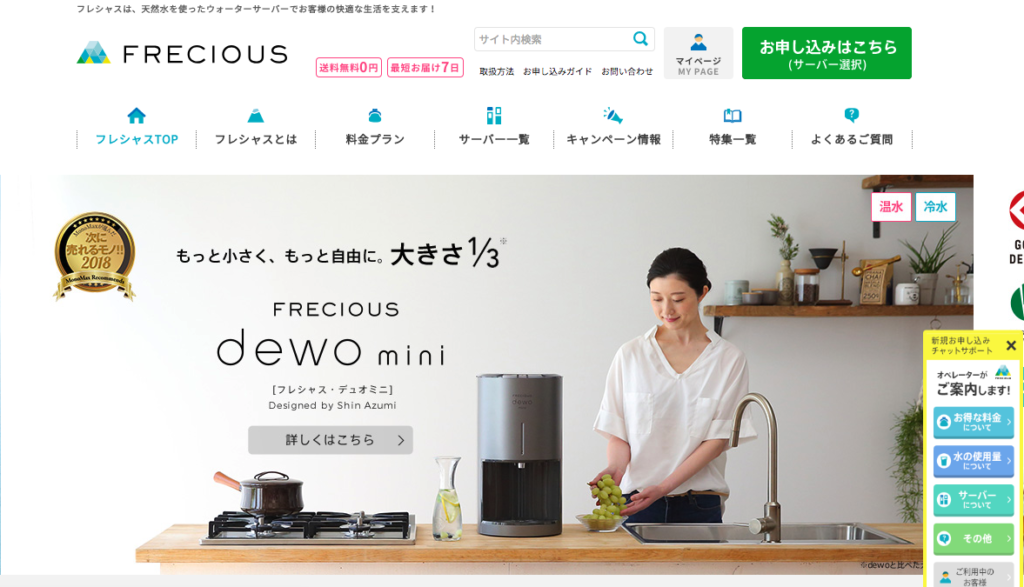 ウォーターサーバーをただ水が出るだけのものではなく、インテリアとしても良いものを選びたいという人は多いです。フレシャスではウォーターサーバーを設置場所に応じてや、デザインなどで選ぶことが出来ますし、デザインは様々な賞を受賞していることでも知られています。