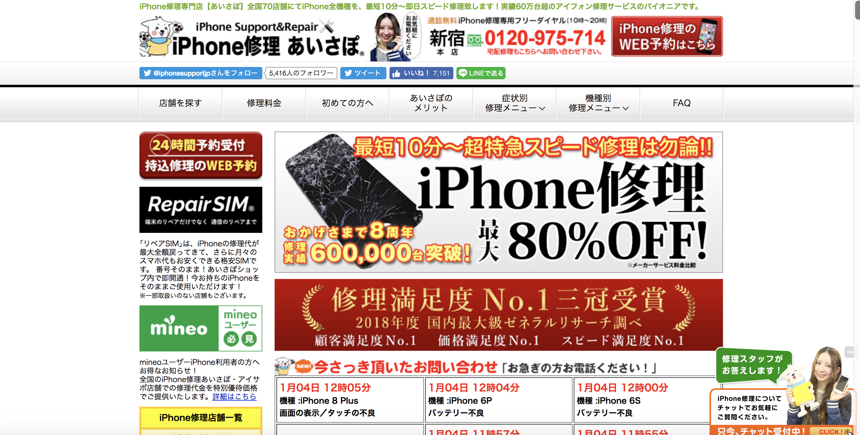 iPhone修理「あいさぽ」では故障した部品のみを交換修理ができる。メーカー修理の半額以下、最大80%offのサービス料金を実現しているのが特徴です。
