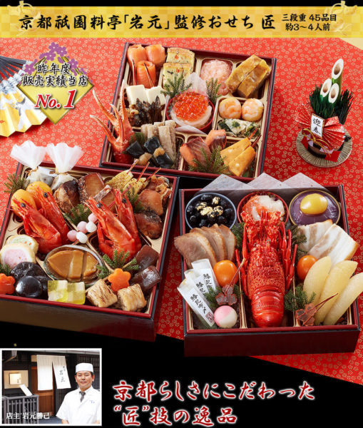 『京都祇園岩元監修』のおせち料理は、販売実績ナンバーワンを更新し続ける自慢のメニューです。特にアワビやエビなどの海の幸は、産地から生きたままの状態で仕入れを行っています。